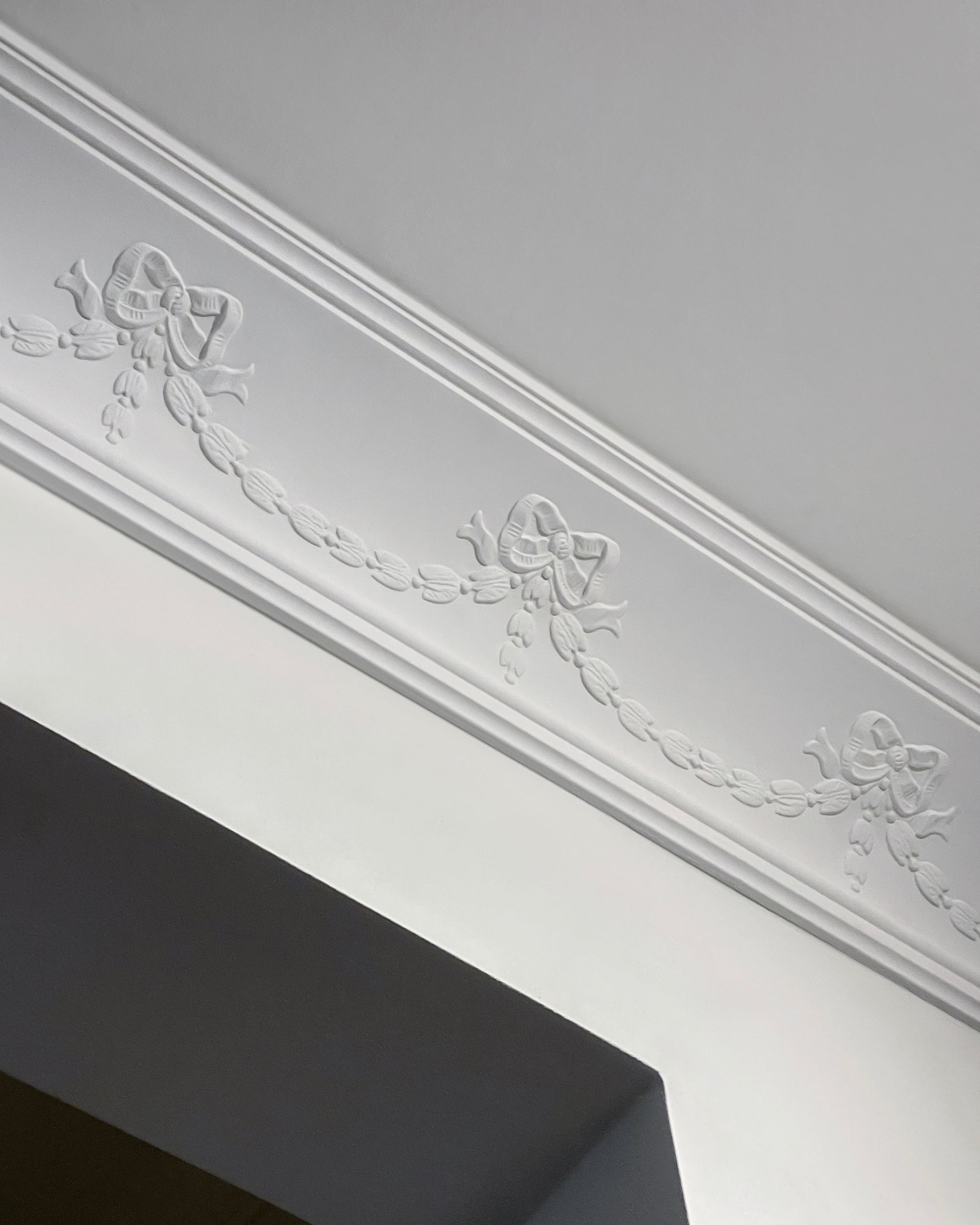 Mellanstor taklist med detaljerade ornament och harmoniska proportioner. Påminner om de vackra stuckaturer som en gång prydde salonger, sovrum och entréer i välbevarade fastigheter från åren kring 1900.